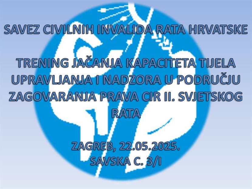 Dana 22. svibnja 2025. godine u prostorijama SCIRH, Zagreb, Savska c. 3/I održan je Trening jačanja kapaciteta tijela upravljanja i nadzora u području zagovaranja prava civilnih invalida II. svjetskog rata.